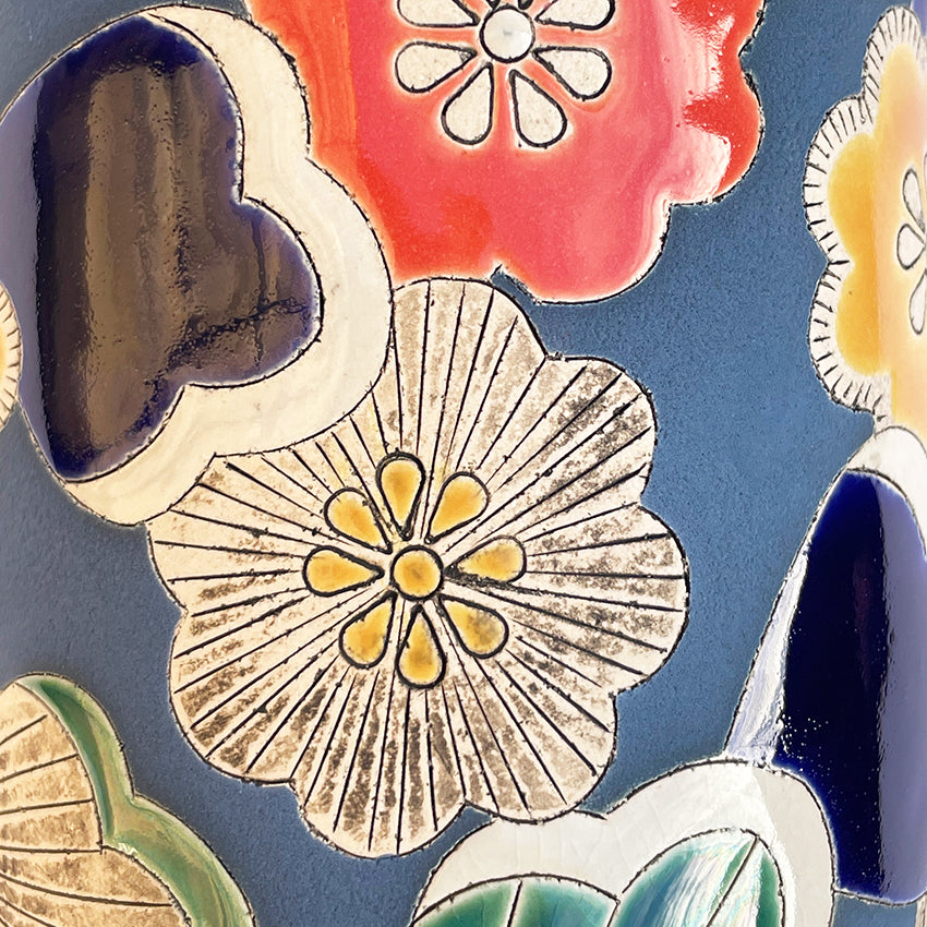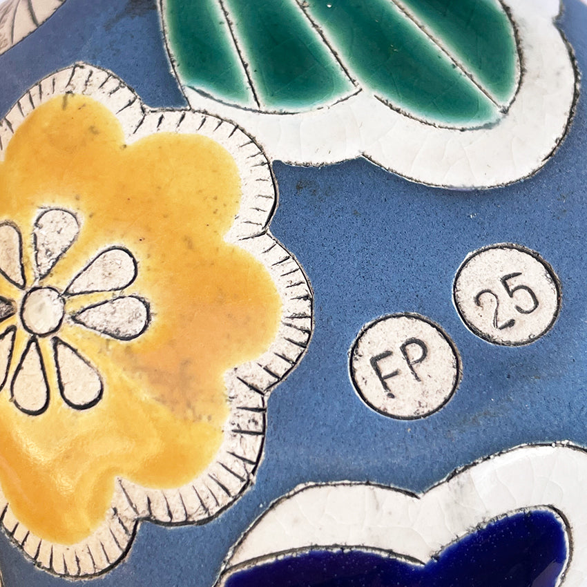 The Tulip and Blossom Motif design has been inscribed with a scalpel, washed with a black oxide and hand painted with vitreous slips and glazes in cobalt, emerald, coral and dusky blue. Made by Frances in her Edinburgh studio, every work has its own unique composition and dimensions. All works are stamped with FP and the year of making.