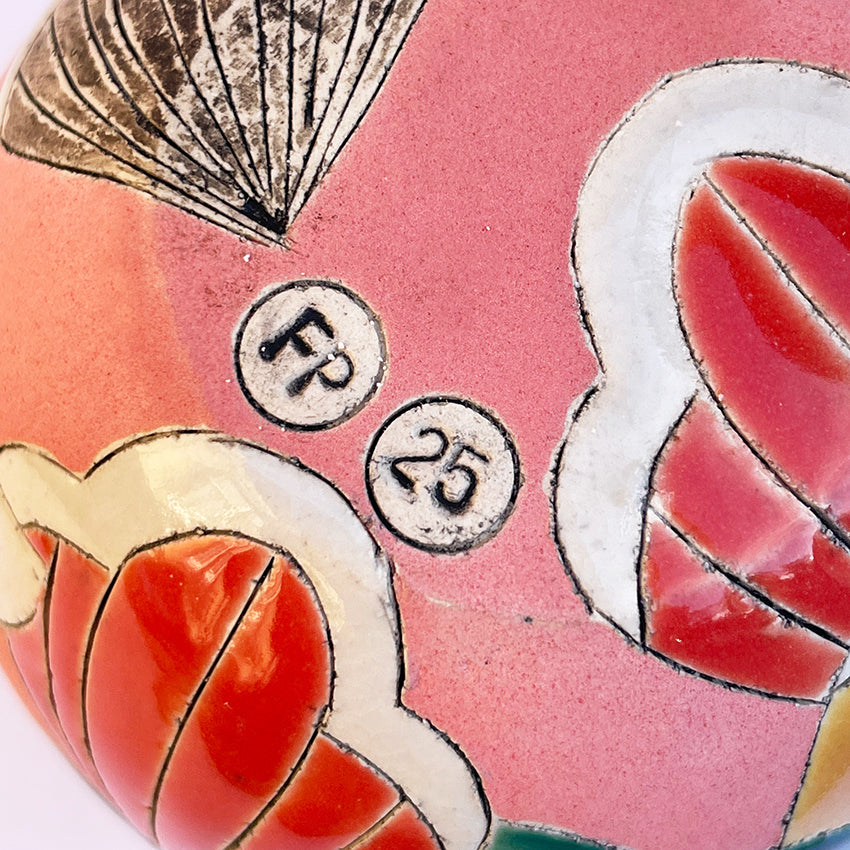 The Tulip and Lobelia Motif design has been inscribed with a scalpel, washed with a black oxide and hand painted with vitreous slips and glazes in gold, coral, emerald, turquoise and salmon. Made by Frances in her Edinburgh studio, every work has its own unique composition and dimensions. All works are stamped with FP and the year of making.